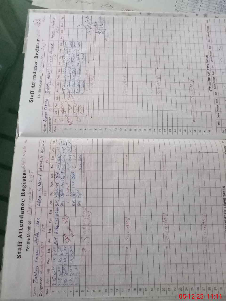 | CNIC | Full Name | Designation | R/C | Absence During Last Calender Month |