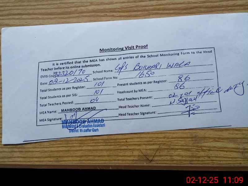 | EMIS Code: 32320170 | Name of School: GPS BUKHARI WALA | |||