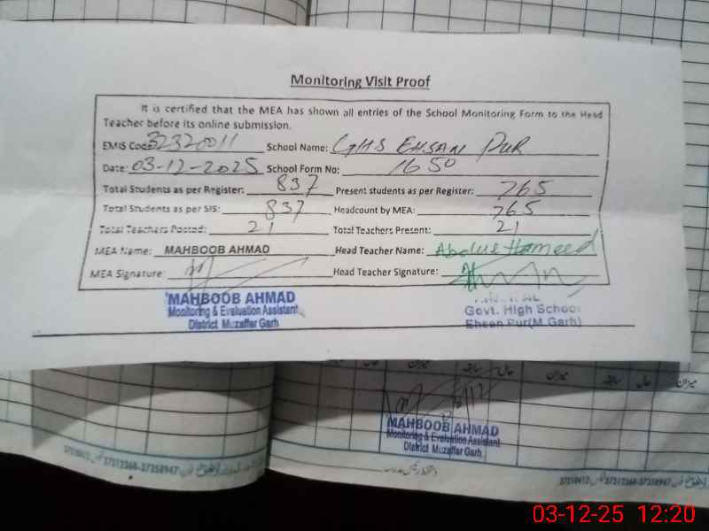 | EMIS Code: 32320011 | Name of School: GHS EHSAN PUR | |||