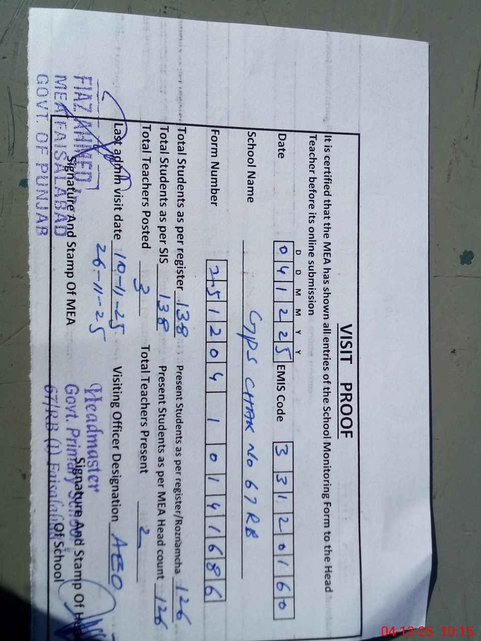 | Attendance Register | Head Teacher | MEA with School | Visit Proof |