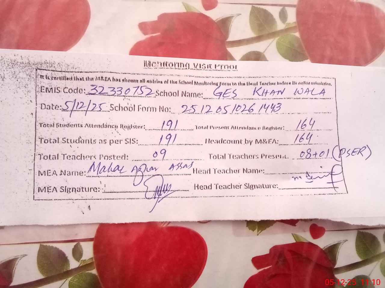 | Attendance Register | Head Teacher | MEA with School | Visit Proof |