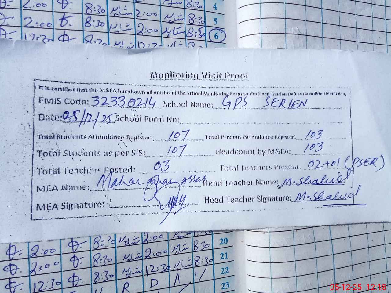 | Attendance Register | Head Teacher | MEA with School | Visit Proof |