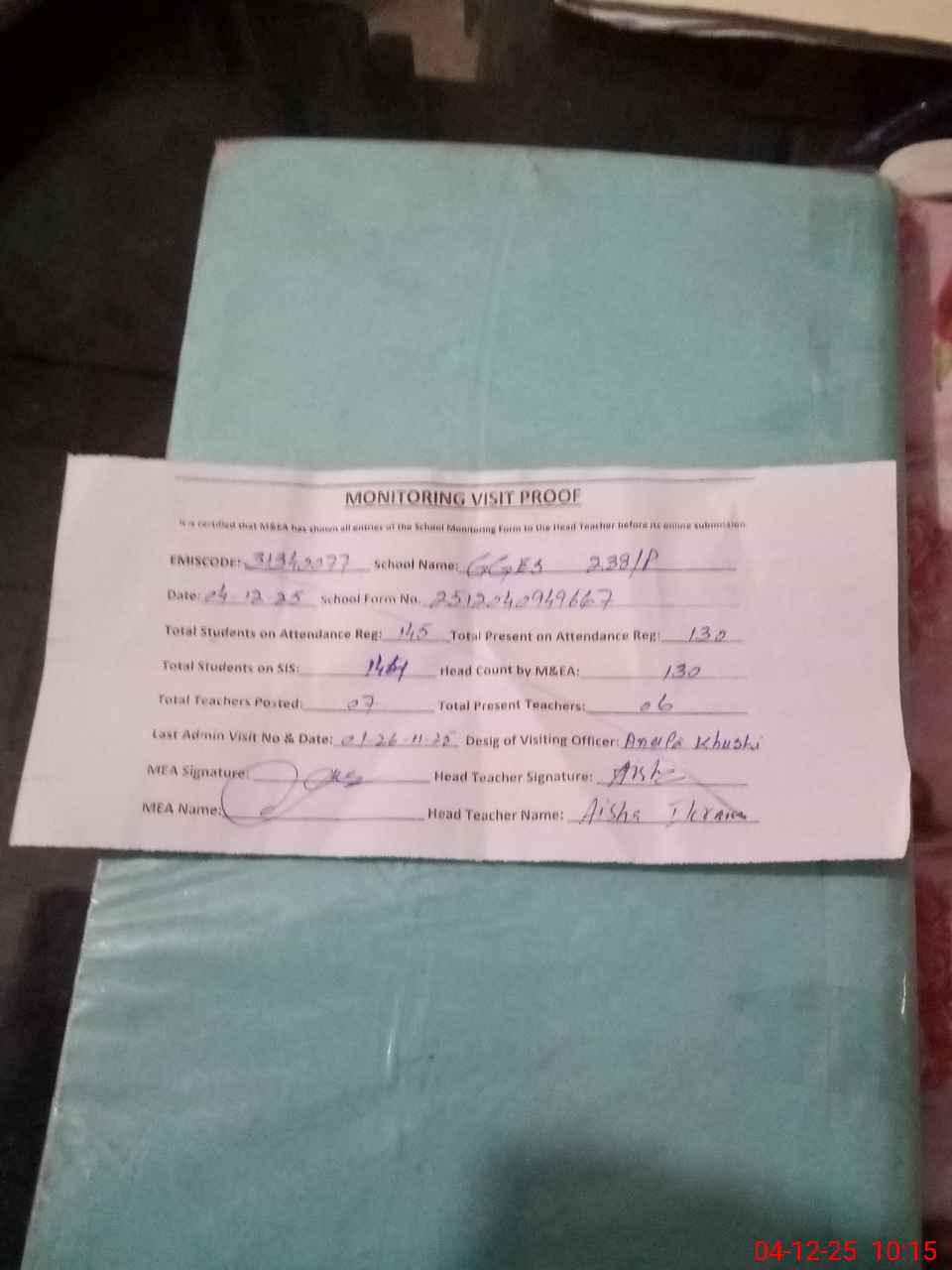 | Attendance Register | Head Teacher | MEA with School | Visit Proof |