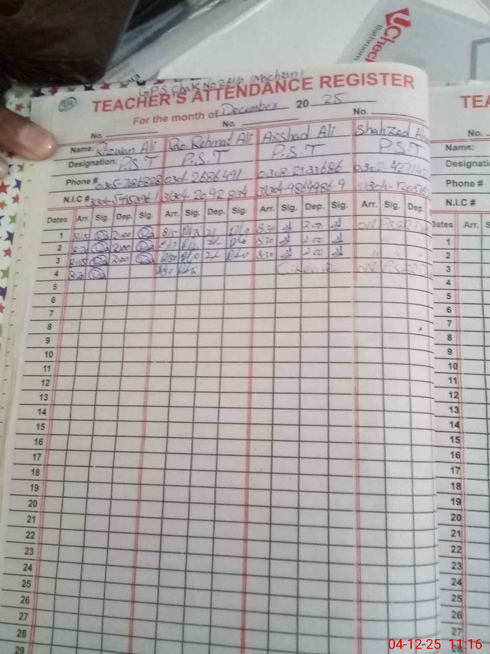 | Name: Ri**** Al**** Designation: (School Headmaster's/Headmistress's) PST Phone/Cell Number: 03**** |