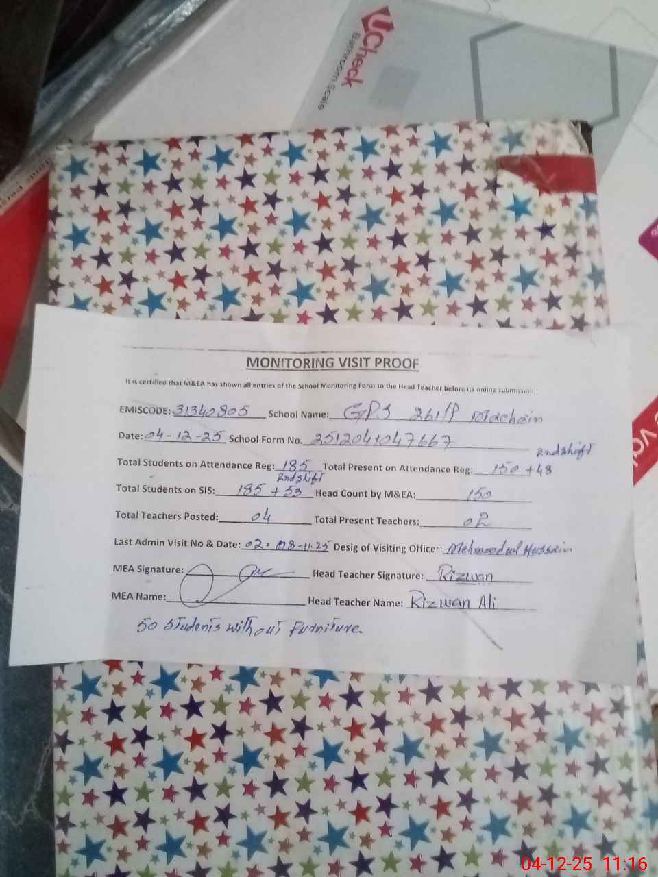 | Attendance Register | Head Teacher | MEA with School | Visit Proof |