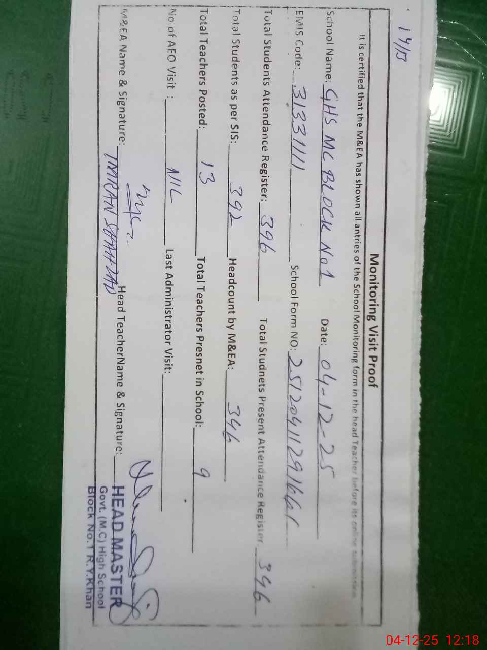 | Attendance Register | Head Teacher | MEA with School | Visit Proof |