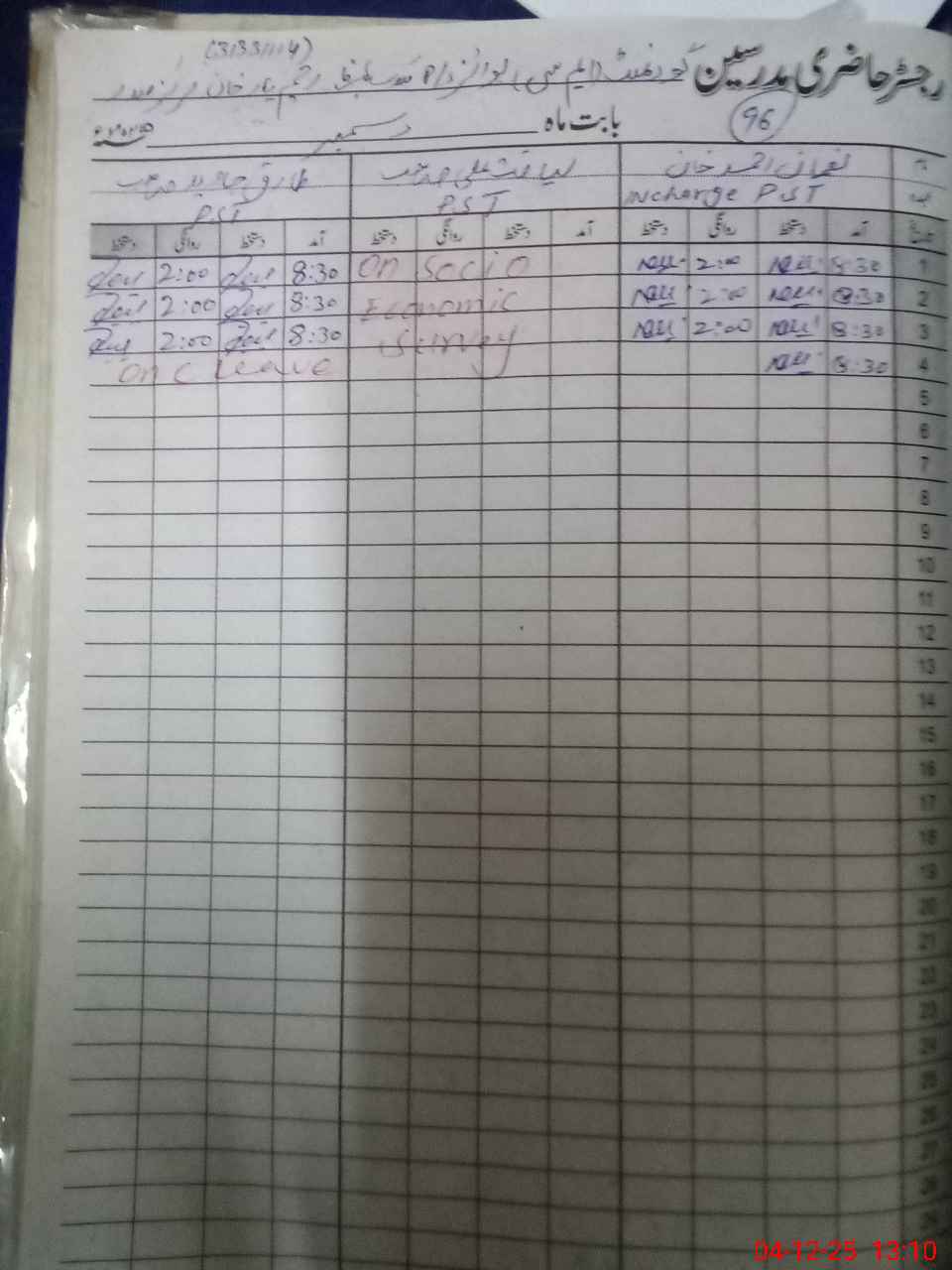 | CNIC | Full Name | Designation | R/C | Absence During Last Calender Month |