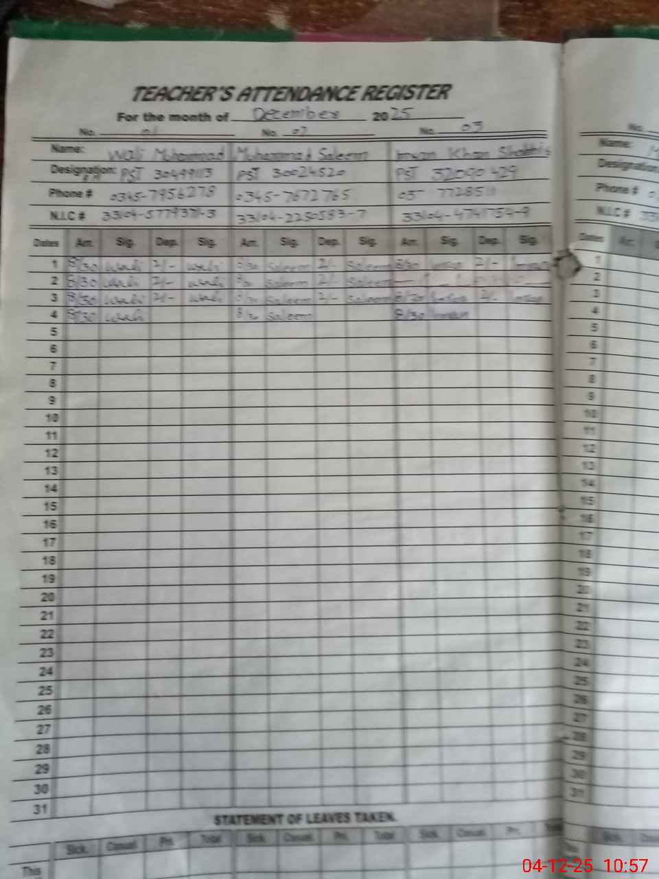 | CNIC | Full Name | Designation | R/C | Absence During Last Calender Month |