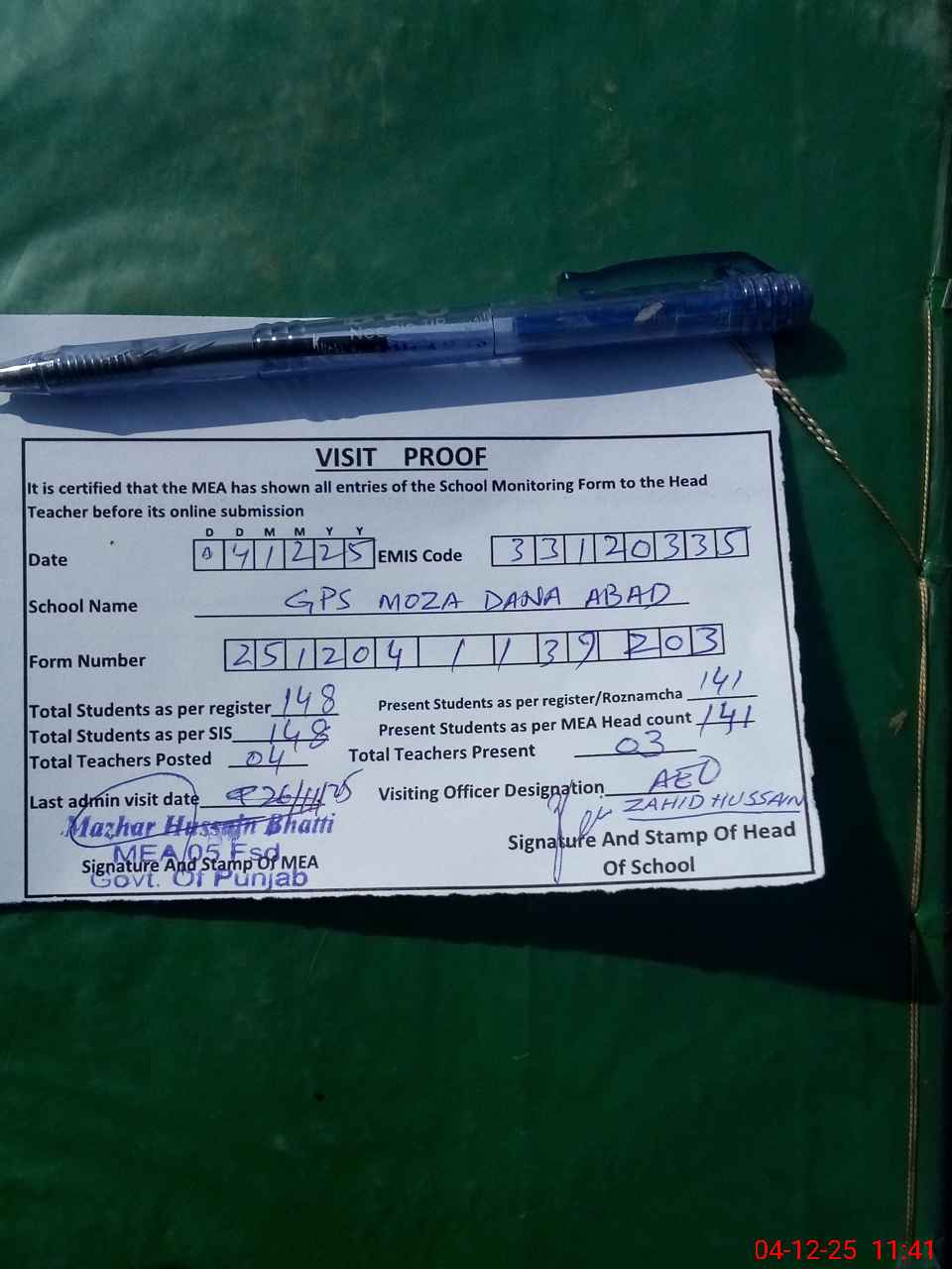 | Attendance Register | Head Teacher | MEA with School | Visit Proof |