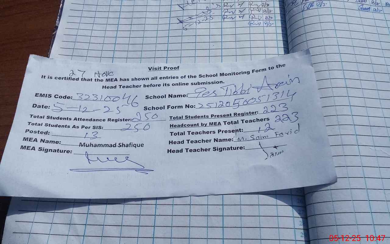 | EMIS Code: 32310046 | Name of School: GES TIBBI ARAIN | |||