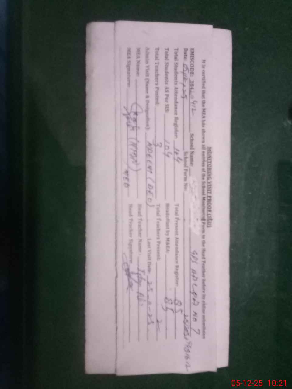 | Attendance Register | Head Teacher | MEA with School | Visit Proof |