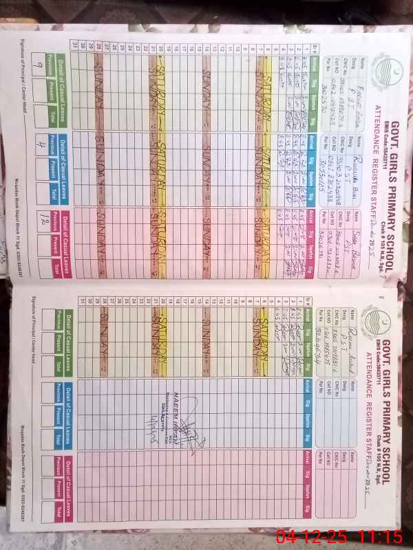 | CNIC | Full Name | Designation | R/C | Absence During Last Calender Month |