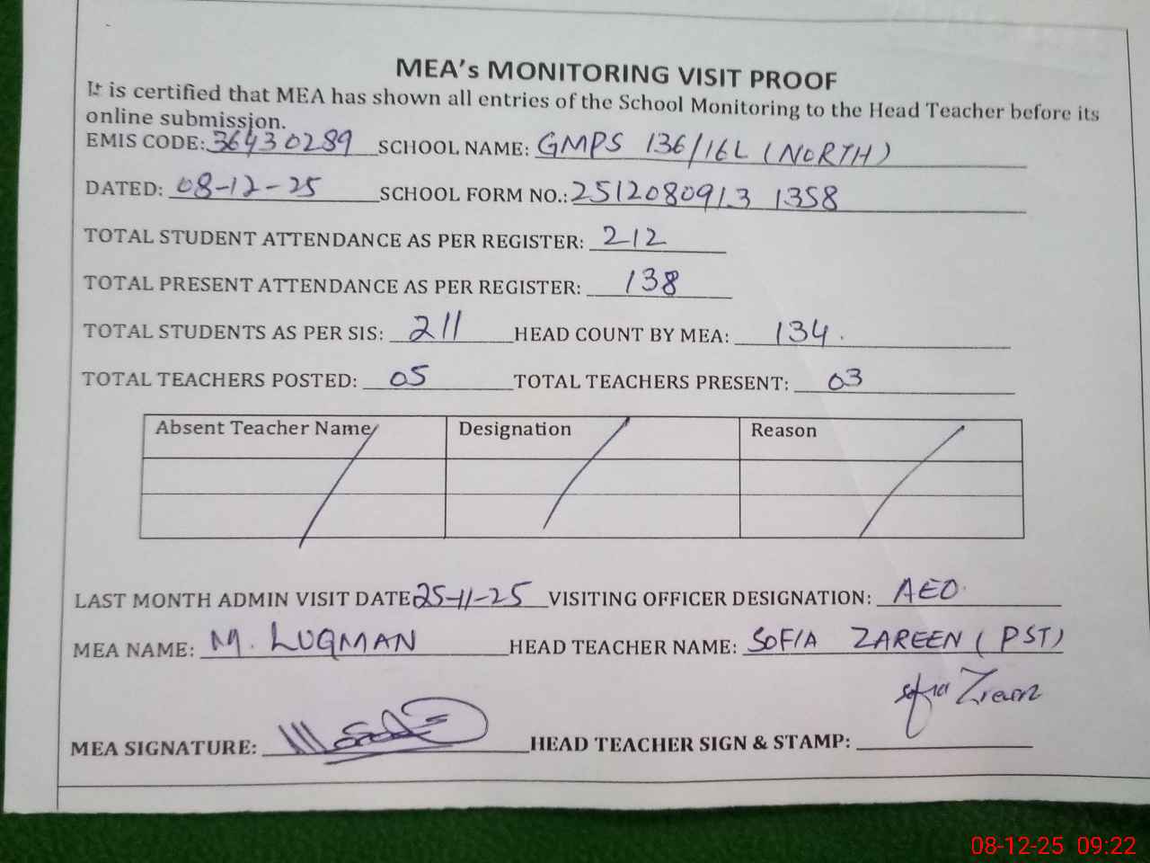 | Attendance Register | Head Teacher | MEA with School | Visit Proof |