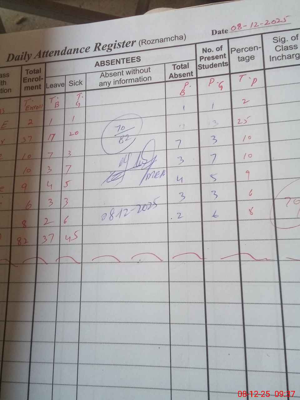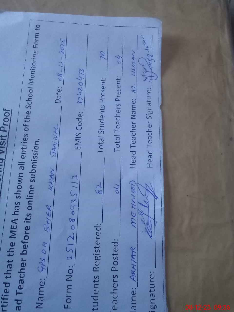 | Attendance Register | Head Teacher | MEA with School | Visit Proof |