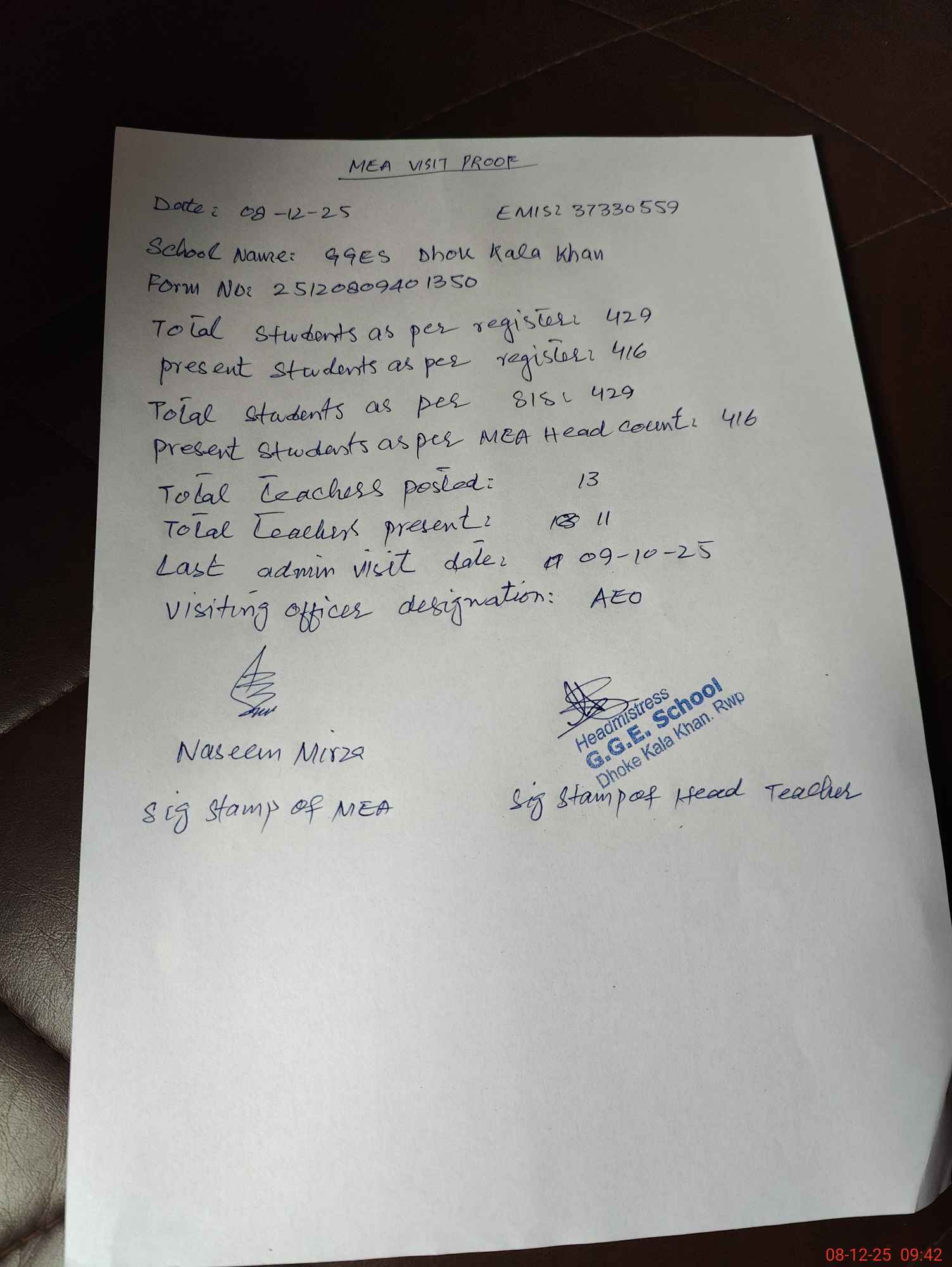 | EMIS Code: 37330559 | Name of School: GGES DHOK KALA KHAN | |||