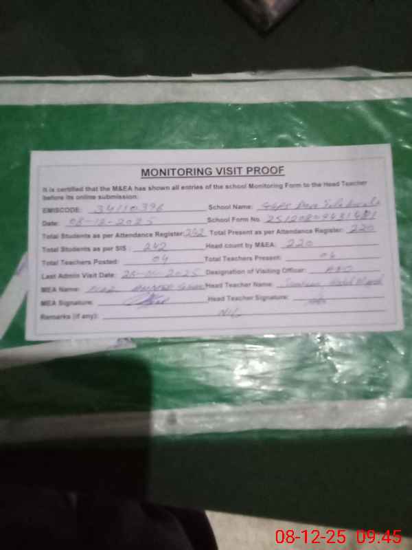 | Attendance Register | Head Teacher | MEA with School | Visit Proof |