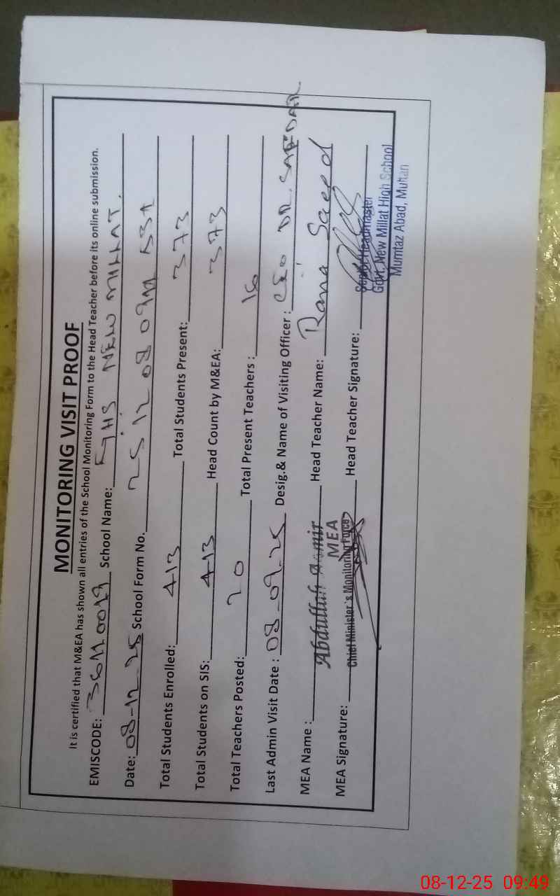 | EMIS Code: 36110019 | Name of School: GHS NEW MILLAT MUMTAZABAD MULTAN | |||