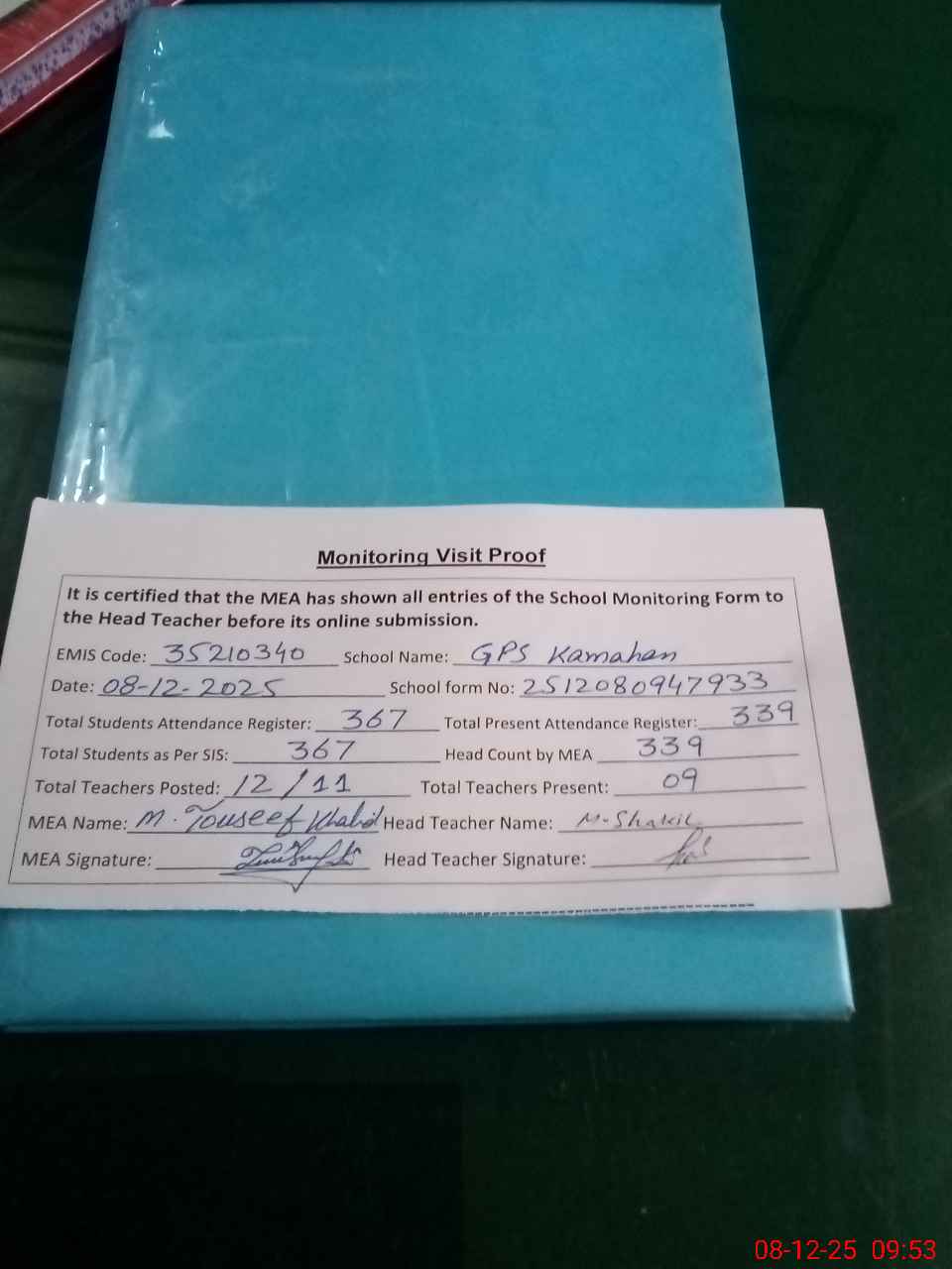 | Attendance Register | Head Teacher | MEA with School | Visit Proof |