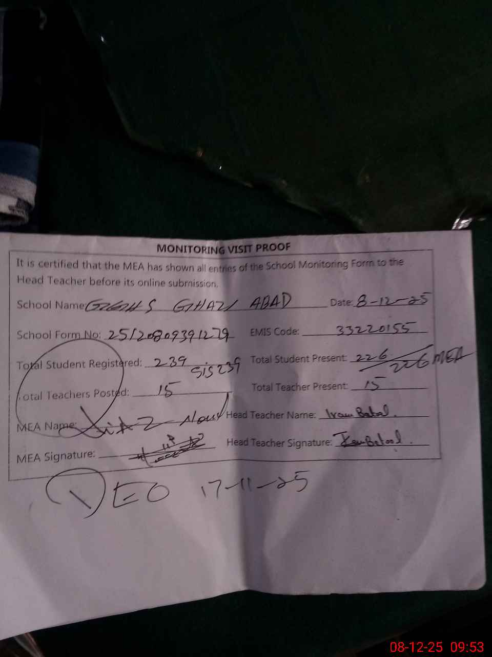 | Certified that this School was Inspected by the Undersigned MEA/DMO Today and the Information Stated Above is as Per Record. | |||||
