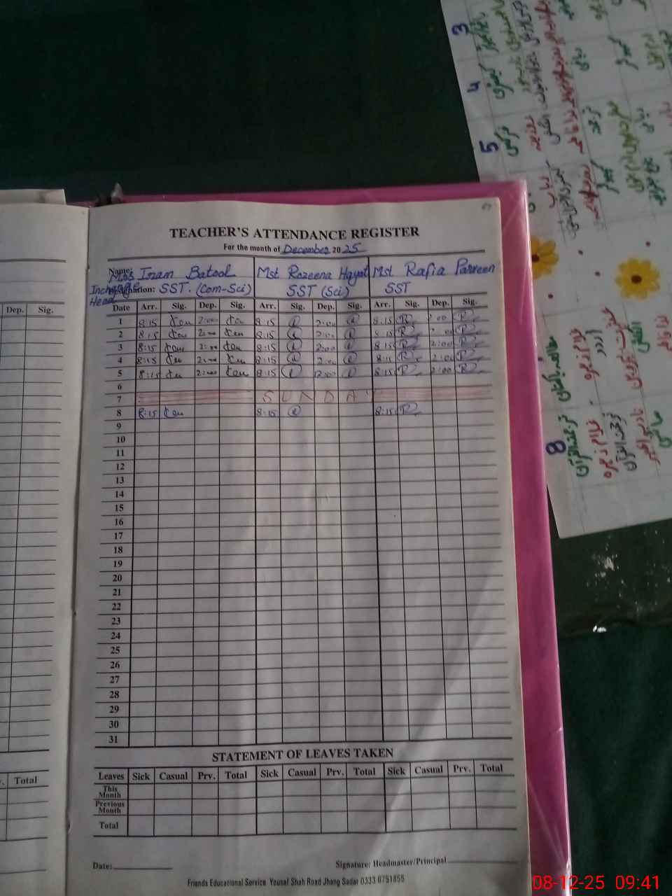 | Attendance Register | Head Teacher | MEA with School | Visit Proof |