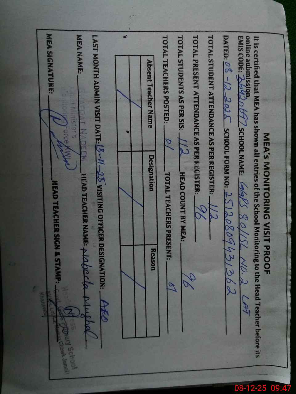 | Attendance Register | Head Teacher | MEA with School | Visit Proof |