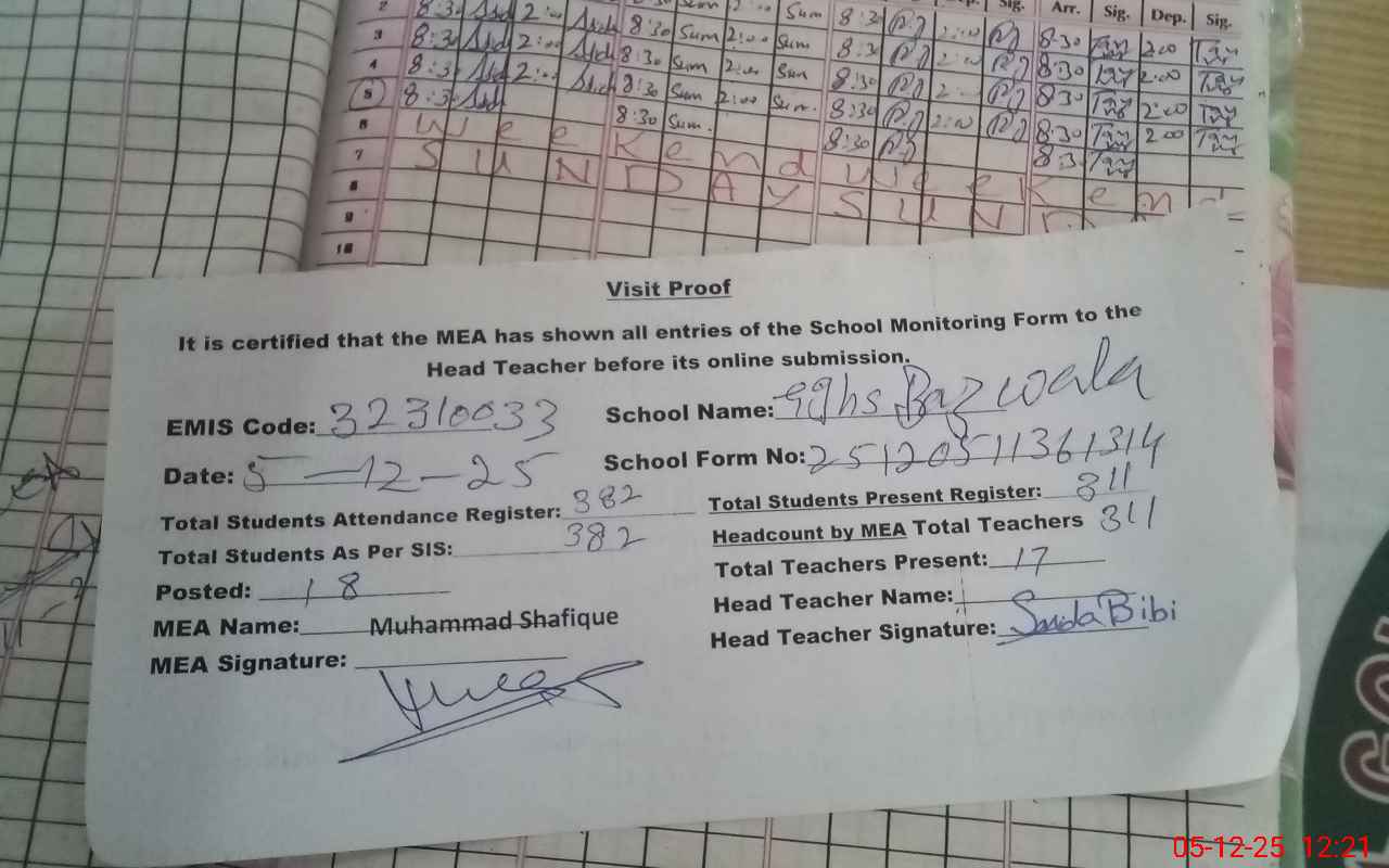 | Attendance Register | Head Teacher | MEA with School | Visit Proof |