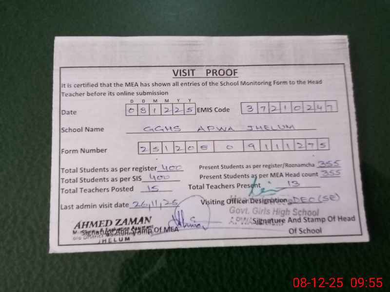 | EMIS Code: 37210247 | Name of School: GGHS APWA JHELUM | |||