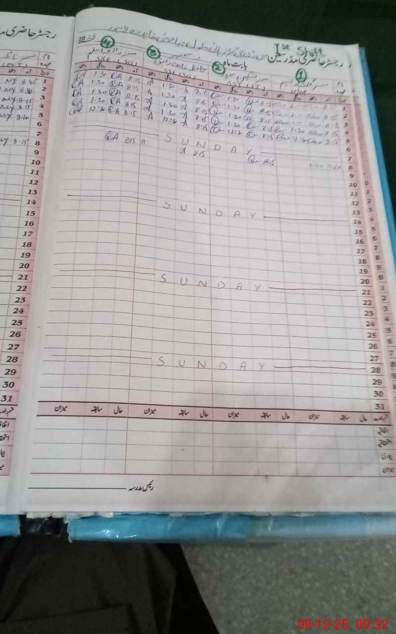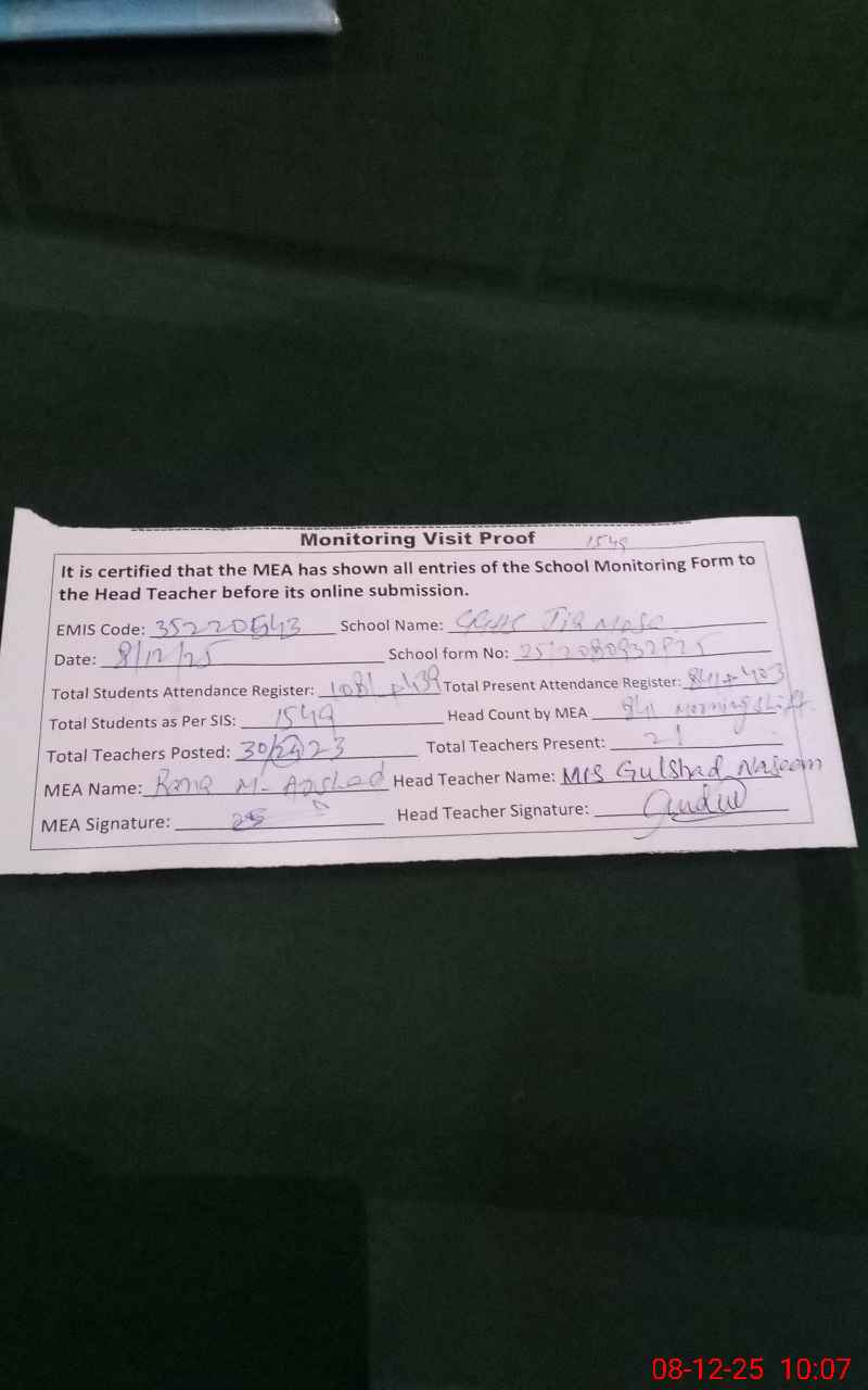 | Remarks (Use Separate Page if Required): Teacher Rehana Tariq EST on medical leave as per attendance register but her Sanctioned medical leave Was not shown to MEA, so according to monitoring sop mark her Absent. NSB record on SIS not maintain after October,2025. School Council meeting karwai not provide to MEA. Furniture required for 300 students | |||||
