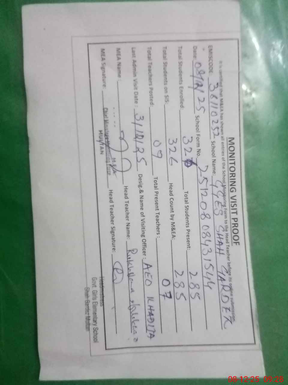 | Attendance Register | Head Teacher | MEA with School | Visit Proof |