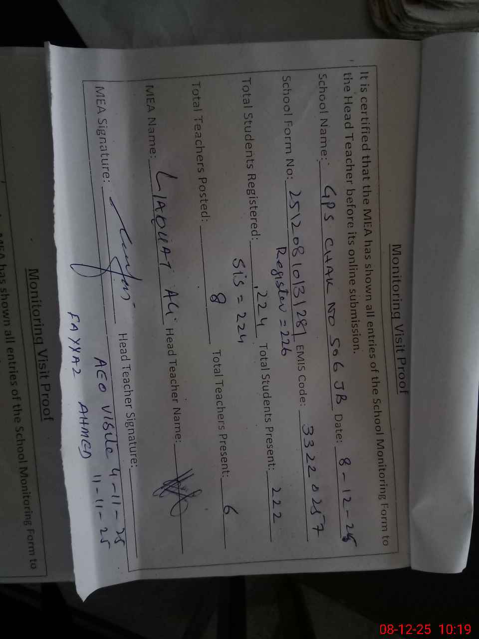 | Attendance Register | Head Teacher | MEA with School | Visit Proof |