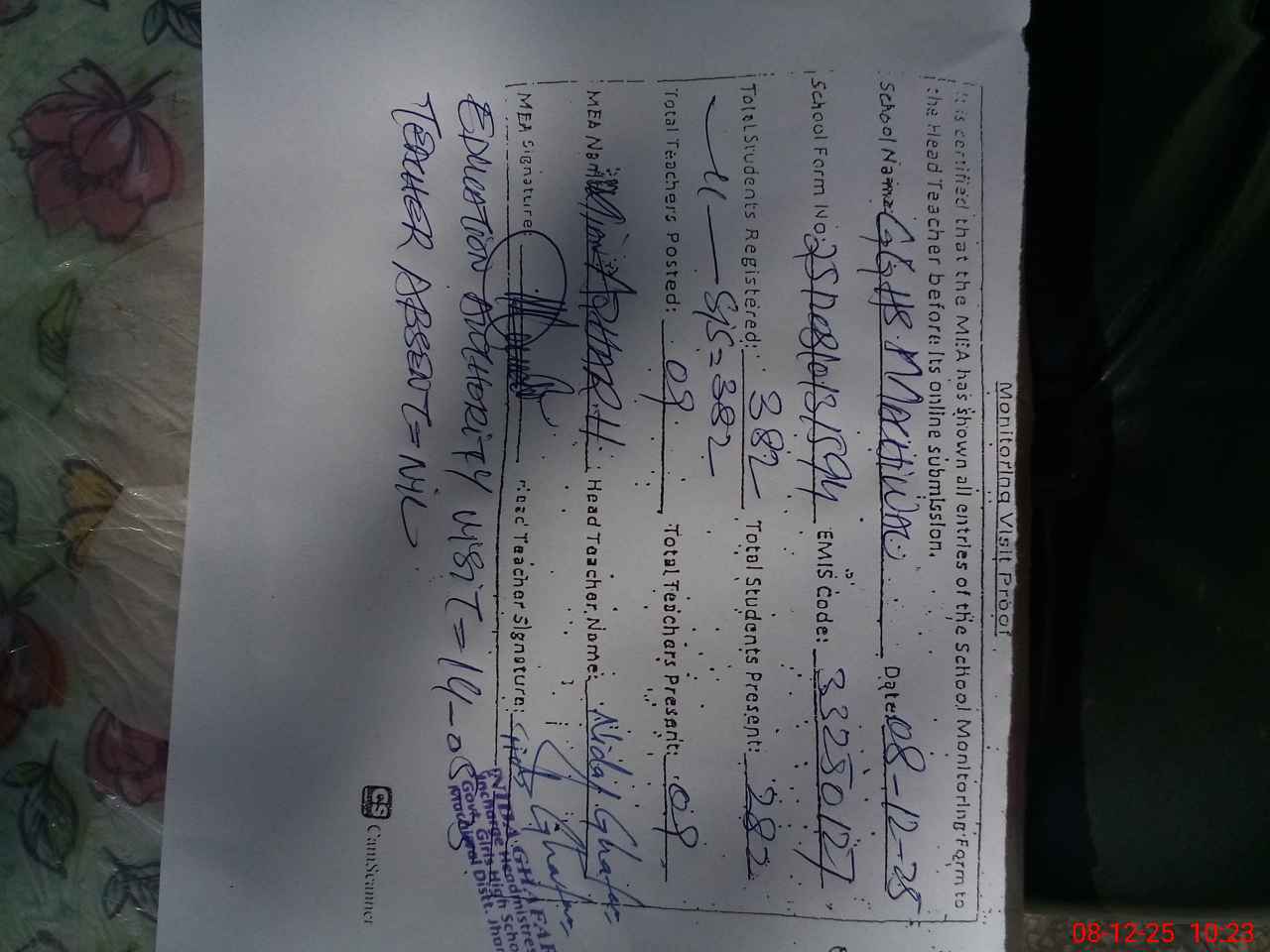 | Attendance Register | Head Teacher | MEA with School | Visit Proof |