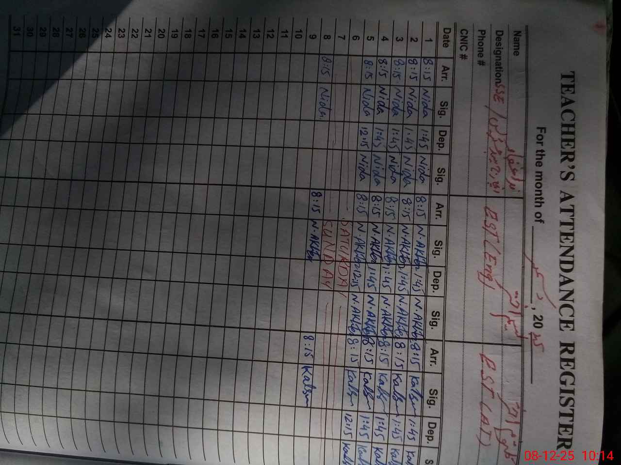| CNIC | Full Name | Designation | R/C | Absence During Last Calender Month |