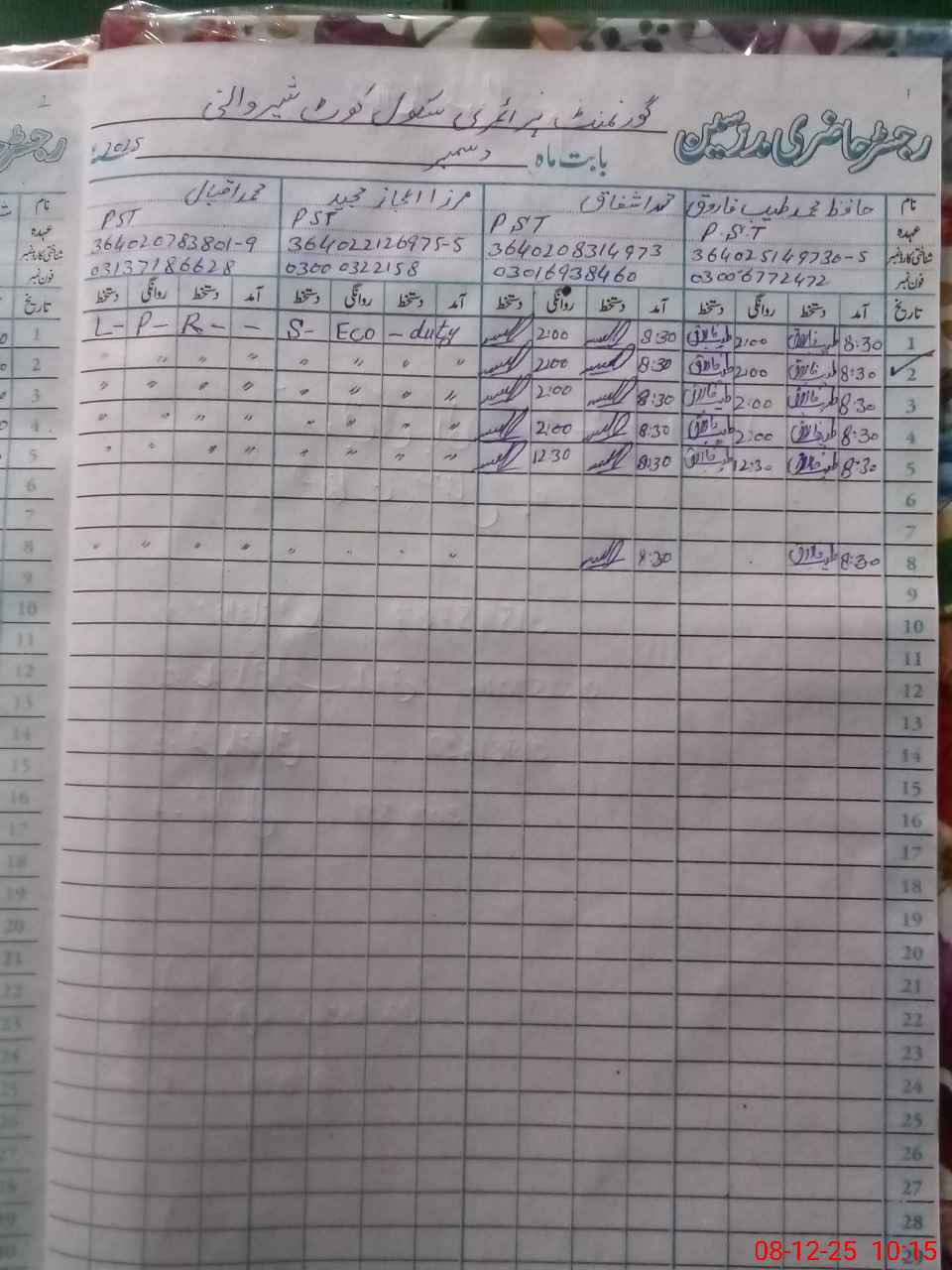 | CNIC | Full Name | Designation | R/C | Absence During Last Calender Month |