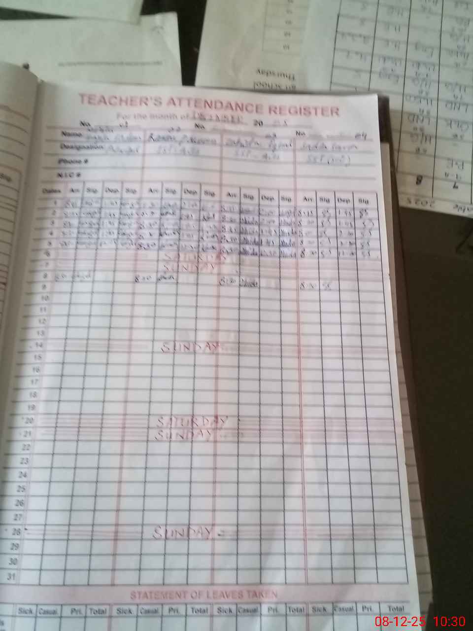 | CNIC | Full Name | Designation | R/C | Absence During Last Calender Month |