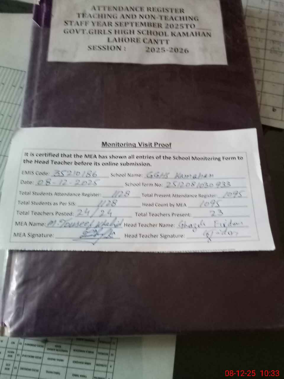 | Attendance Register | Head Teacher | MEA with School | Visit Proof |