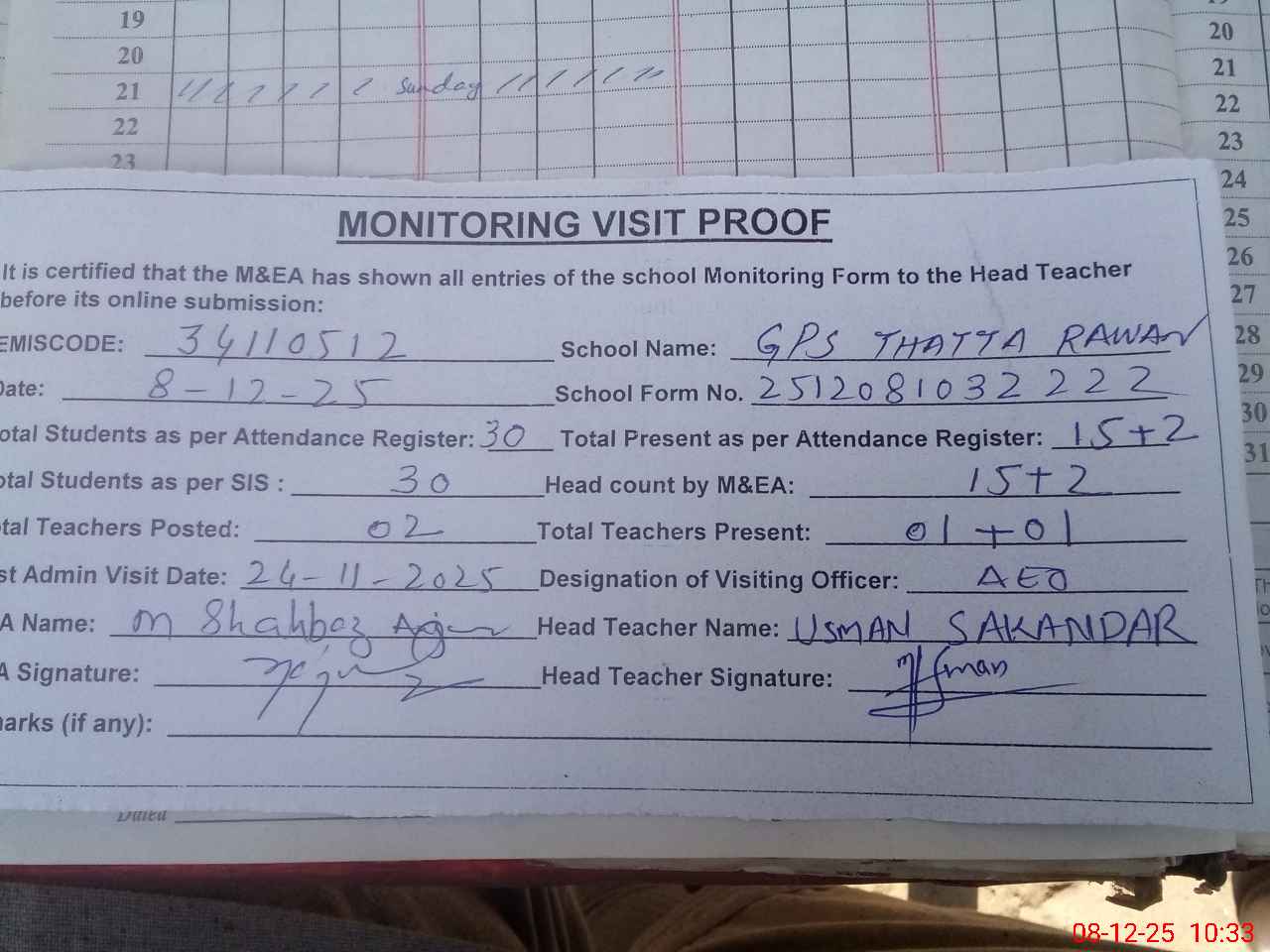 | Attendance Register | Head Teacher | MEA with School | Visit Proof |