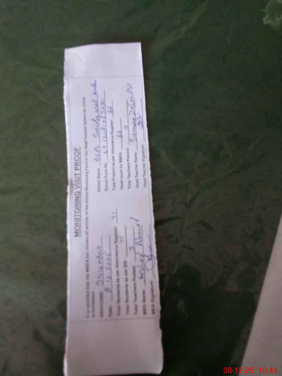 | Attendance Register | Head Teacher | MEA with School | Visit Proof |