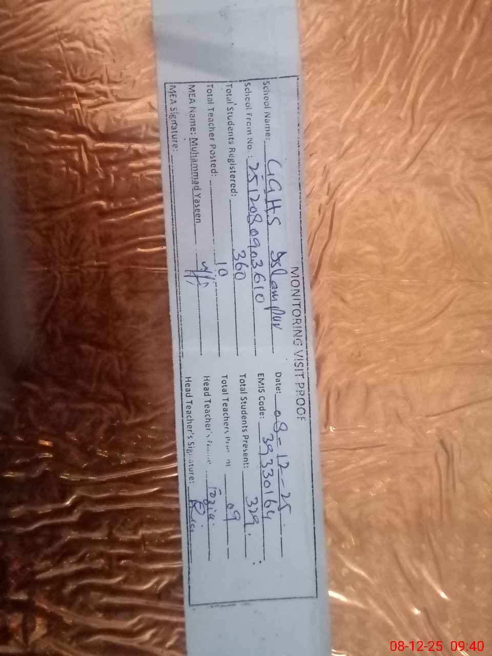 | Certified that this School was Inspected by the Undersigned MEA/DMO Today and the Information Stated Above is as Per Record. | |||||