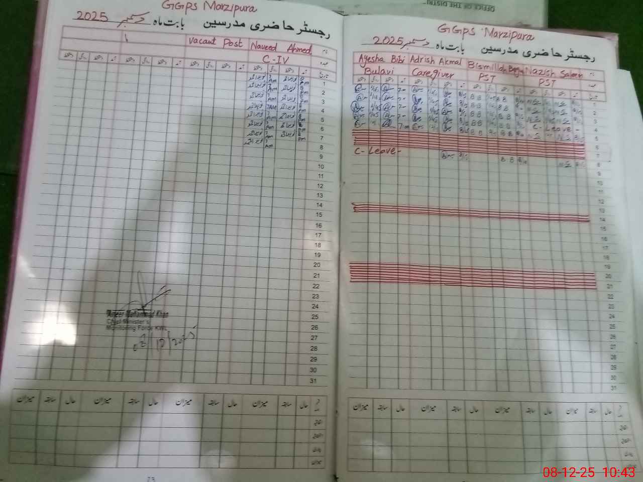 | CNIC | Full Name | Designation | R/C | Absence During Last Calender Month |