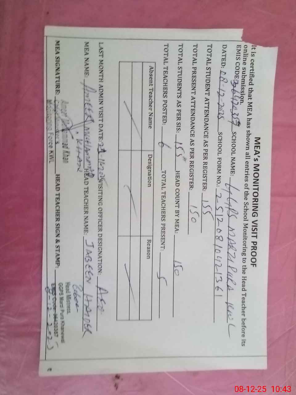 | Attendance Register | Head Teacher | MEA with School | Visit Proof |
