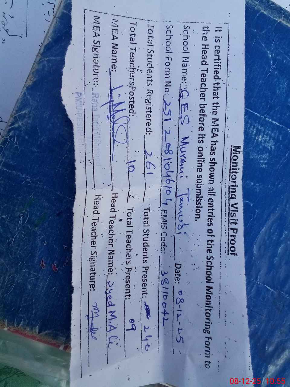 | Attendance Register | Head Teacher | MEA with School | Visit Proof |