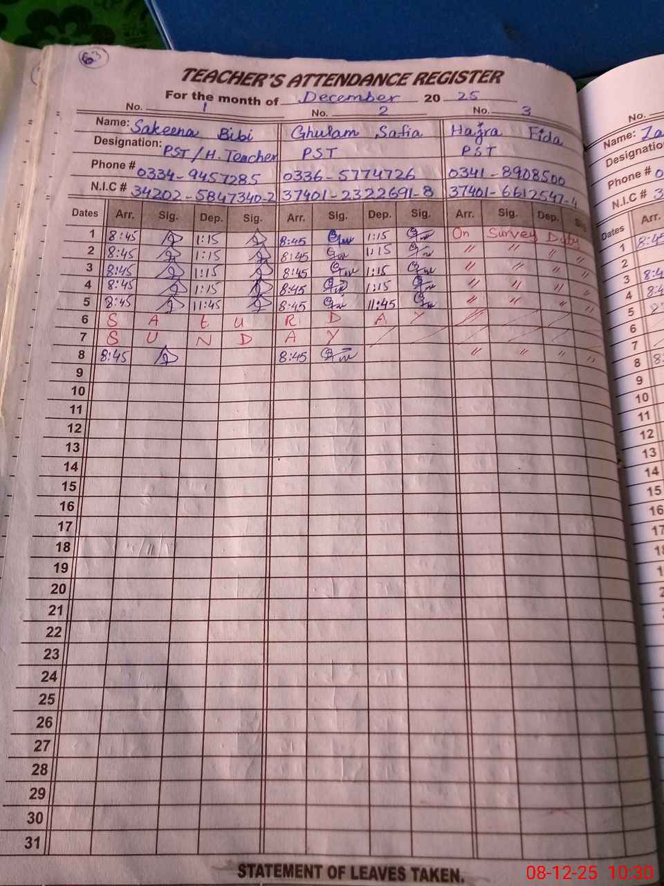 | CNIC | Full Name | Designation | R/C | Absence During Last Calender Month |