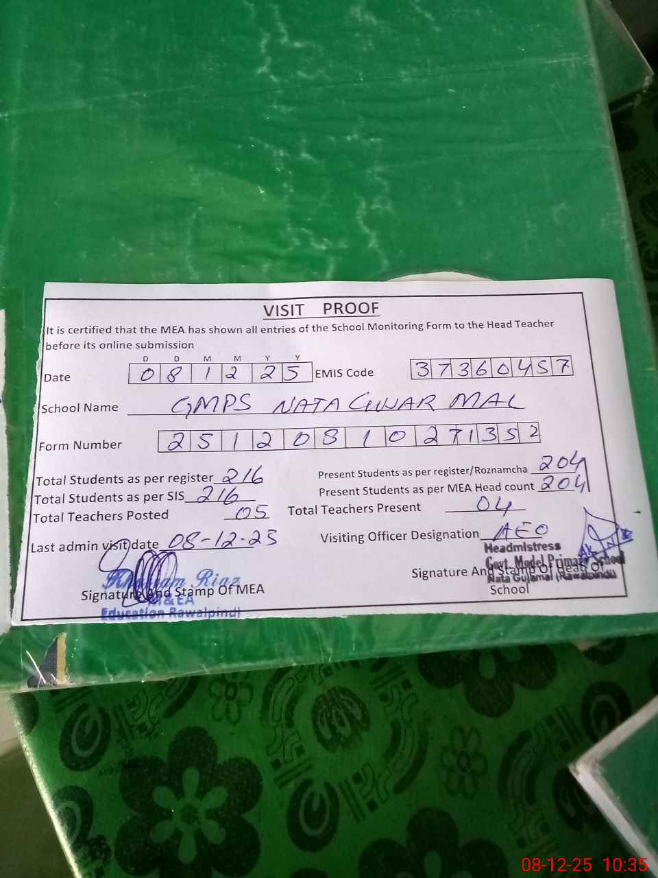 | Attendance Register | Head Teacher | MEA with School | Visit Proof |