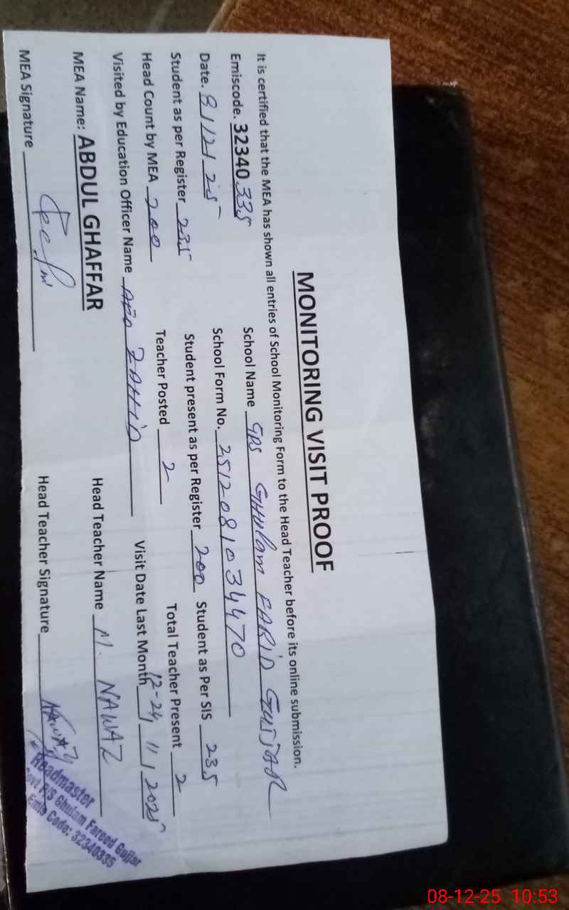 | EMIS Code: 32340335 | Name of School: GPS GHULAM FARID GUJJAR | |||