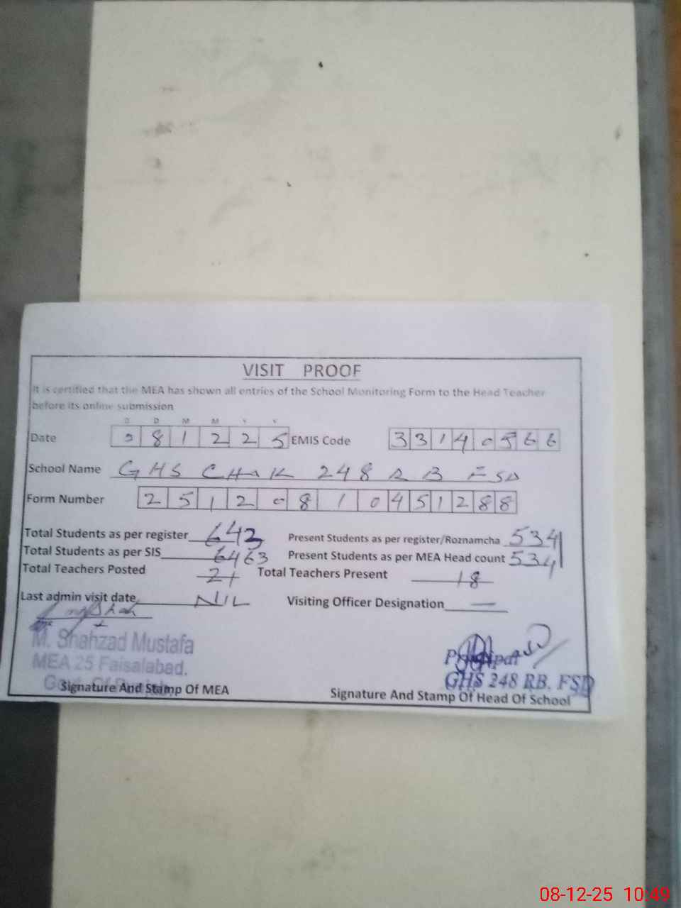| Certified that this School was Inspected by the Undersigned MEA/DMO Today and the Information Stated Above is as Per Record. | |||||