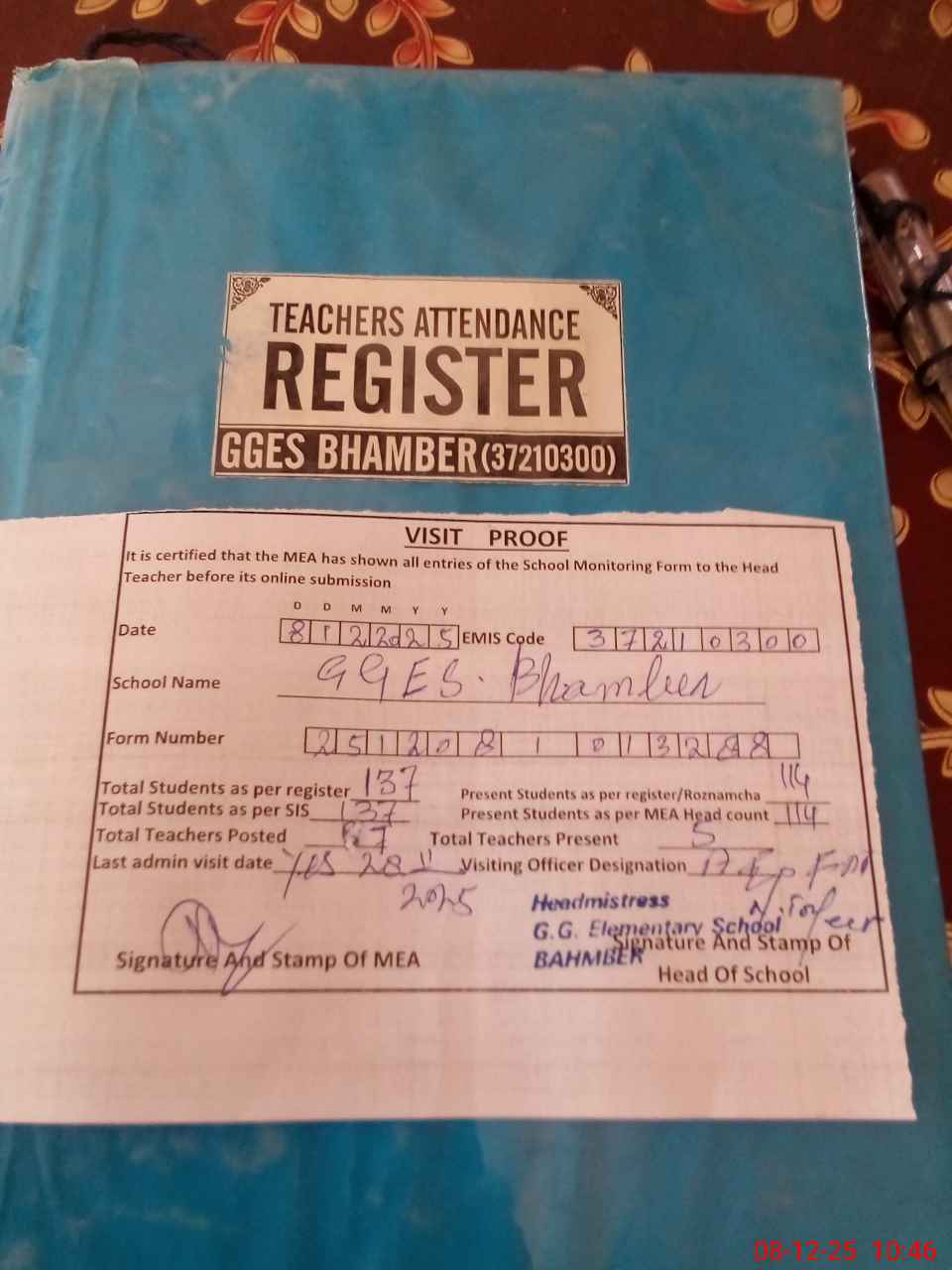 | Attendance Register | Head Teacher | MEA with School | Visit Proof |