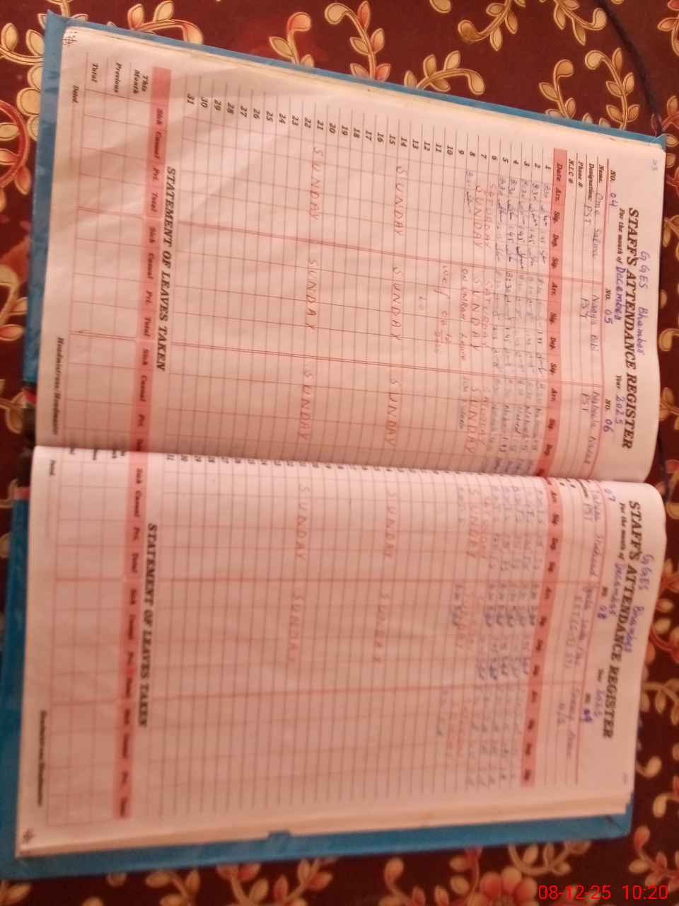 | CNIC | Full Name | Designation | R/C | Absence During Last Calender Month |