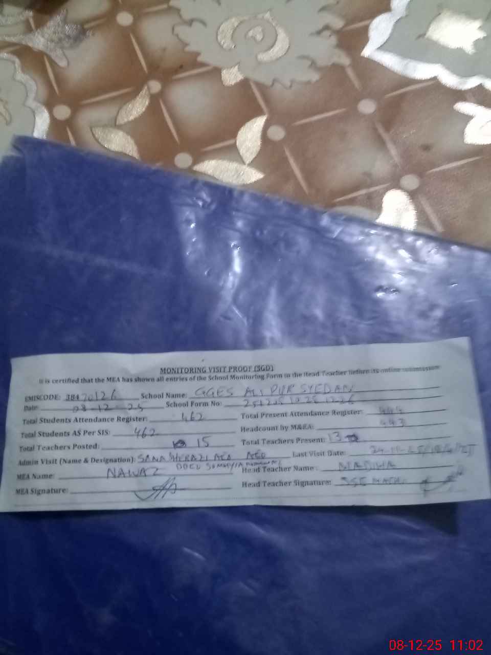 | Attendance Register | Head Teacher | MEA with School | Visit Proof |