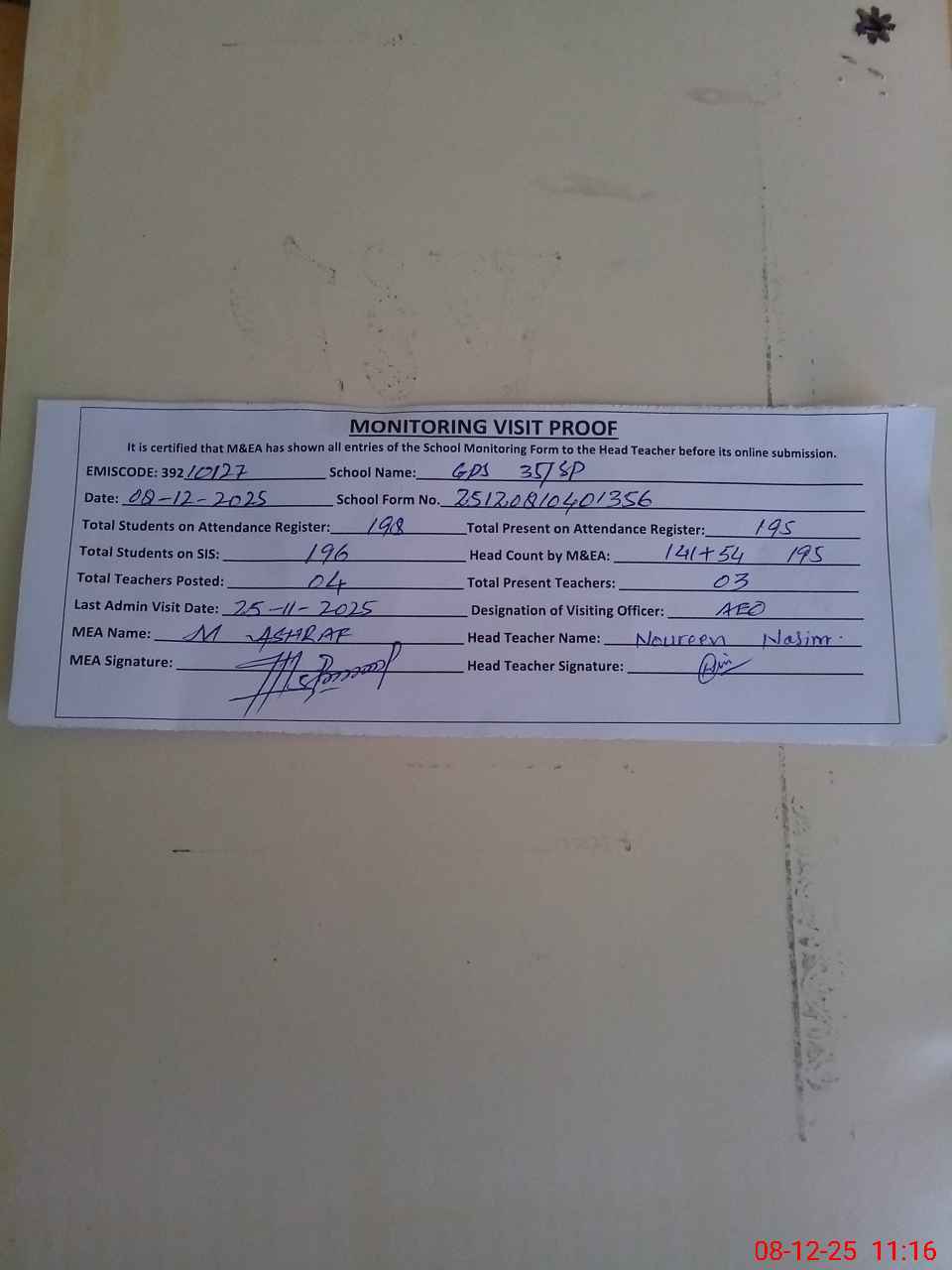 | Attendance Register | Head Teacher | MEA with School | Visit Proof |