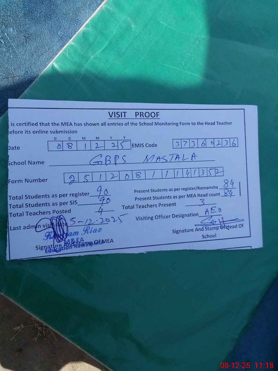 | Attendance Register | Head Teacher | MEA with School | Visit Proof |
